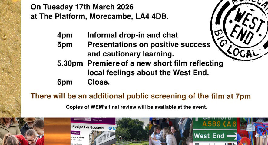 The West End Morecambe (Big Local) 10 years comes to an end in March and to mark the project’s close we will be holding a closing event at The Platform, Morecambe LA4 4DB on Tuesday March 17th.